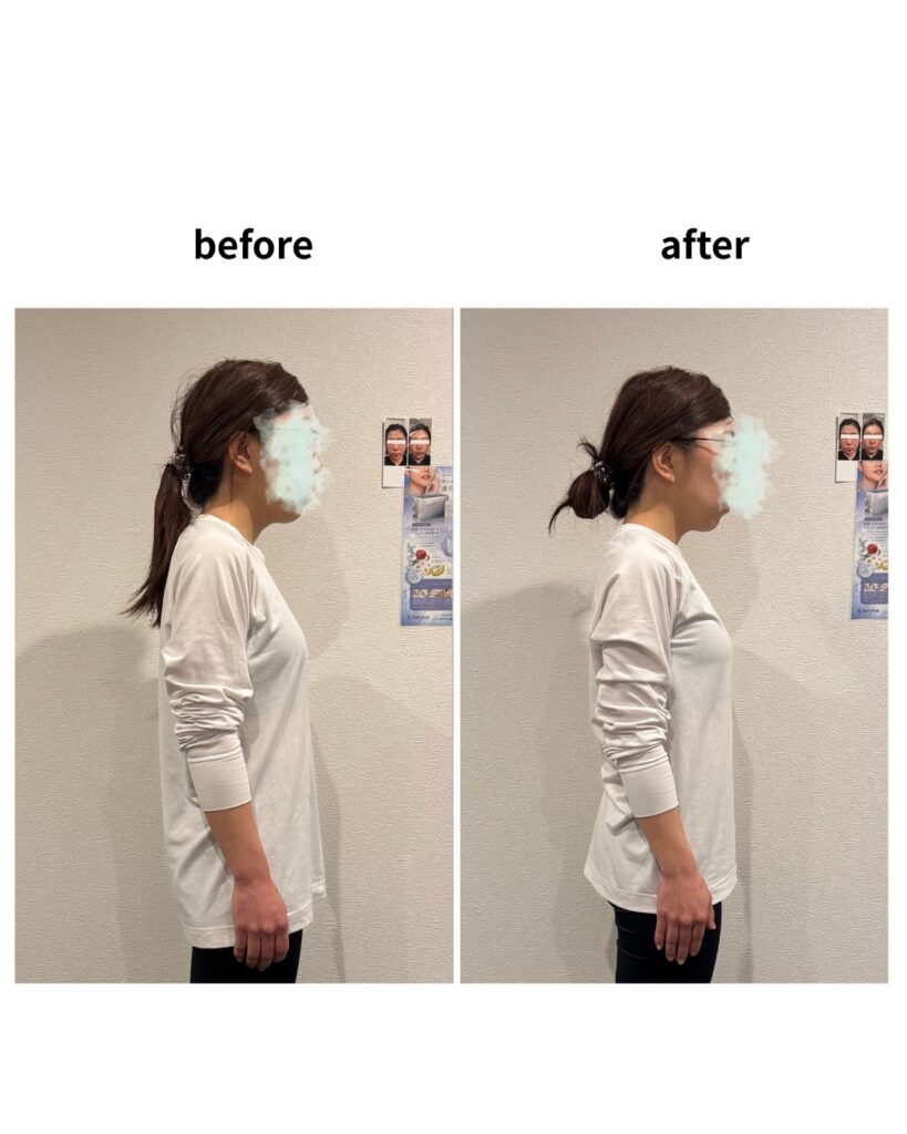 お顔の位置、巻き肩、背中の丸まり、骨盤の向きを調整し体験の少しの時間ではありましたが変化を実感いただけました。